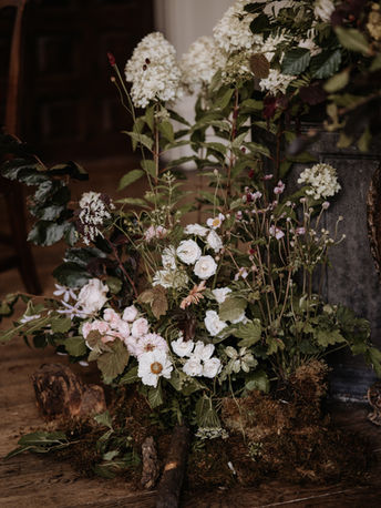Back in one of my favourite venues the stunning Elmore Court, Charlotte and Charlie florals were a seasonl mixture of neutrals with some burgundy tones to lift the design. We create a woodland design to compliment the time of year using moss and logs to bring the outside into Elmores beautiful Great Hall. The couple wanted to have an etherial and magical feel that would translate in the space. The pallette we worked with was essentail in creating this.